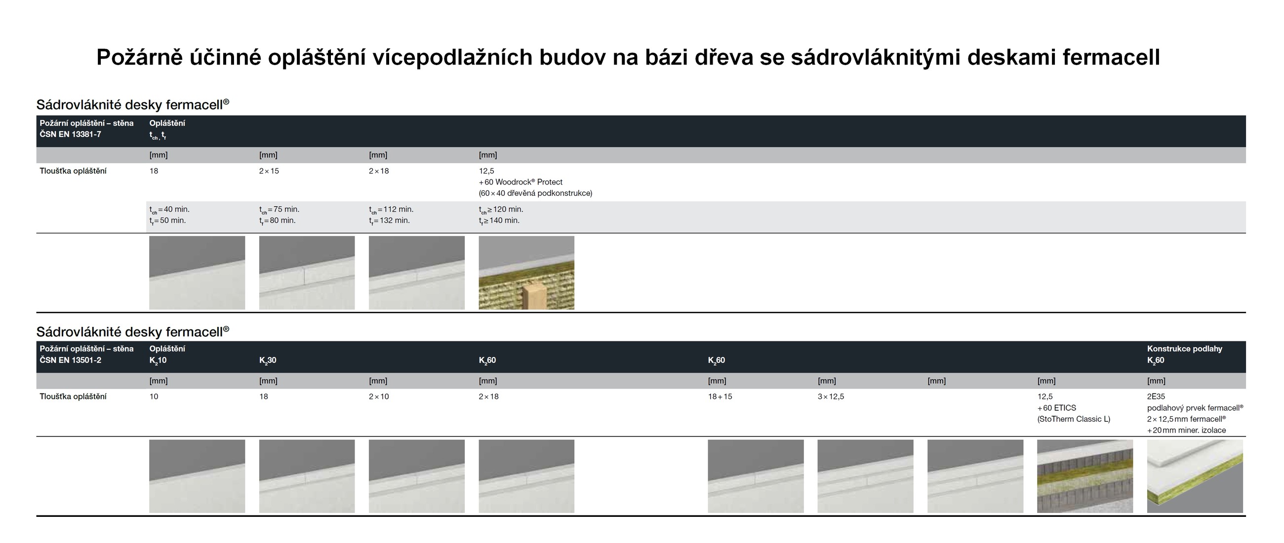 K dispozici jsou v něm požární zkoušky dle ČSN EN 1368-1, nechybí ani nové zkoušky dle ČSN EN 13381-7, které stanovují příspěvek obkladu k požární odolnosti dřevěných prvků. Parametry tch (počátek zuhelnatění dřevěného prvku) a tf (porušení či odpadnutí pláště) umožňují detailní návrh vícepodlažních dřevostaveb podle Eurokódu ČSN EN 1995-1-2. Zkoušky s deskami fermacell® přinášejí až o 25 % lepší výsledky než s běžnými SDK deskami.