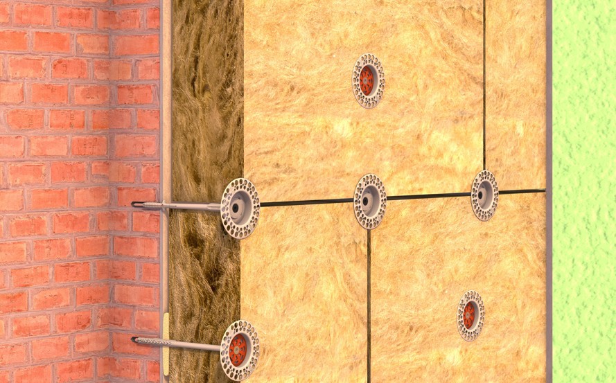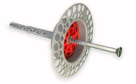 SXRL musí mít souputníka – talířek, který zajišťuje upevnění izolačních desek, jako to dělají talířky u běžných fasádních hmoždinek. Pokud je nové zateplení z polystyrenu, navléká se na SXRL talířek červené barvy s označením DT 60/12. Stejnou kombinaci je možné použít i na desky z minerální vlny, ale výhodnější je v takovém případě doplnit kotvu ještě o rozšířený a prostorově tvarovaný šedý talířek DT 110V s vyšší odolností proti protažení minerální vlnou.