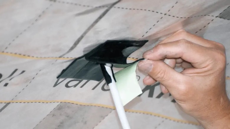 - Odřízněte dva proužky pásky Isover Vario® Stretch dlouhé přibližně 10–15 cm.