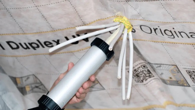 - Kabely stáhněte do kompaktního svazku – ideálně stahovací páskou nebo lepicí páskou. Okolo svazku znovu aplikujte tmel a nechte zaschnout.