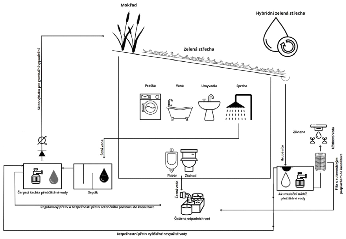 Funkční princip patentovaného řešení hybridní zelené střechy (PAT č. 310 326, 2025) na střeše ČVUT UCEEB je patrný z (Obr. 1). Ve tříkomorovém kompaktním septiku je mechanicky předčištěna odpadní voda, která následně přetéká do čerpací šachty. Pro šedou vodu může být septik nahrazen průtočným filtrem s proplachem umístěným přímo v čerpací šachtě. Jako čerpací šachta může případně sloužit i poslední komora septiku. Z čerpací šachty je mechanicky předčištěná voda čerpána do střešní kořenové čistírny – střešního mokřadu skládajícího se z modulárních plastových žlabů propojených vzájemně pomocí vodotěsného přírubového spoje. Plastové žlaby jsou prefabrikovány z polypropylenu a před propojením vodorovně vyrovnány dle sklonu střechy pomocí polystyrenových spádových klínů. Mokřadní systém se skládá ze tří typů modulů. 1× modul nátokový; 2× modul středový a 1× modul odtokový. Modularita velikosti systému je dosažena libovolným počtem středových modulů a možností instalace rohového modulu pro změnu směru žlabu, přičemž jeden modul je dlouhý 95 cm, široký 80 cm a vysoký 25 cm. Výška hladiny vody v plastových mokřadních modulech je 20 cm. Nátokový a středové moduly jsou vyplněny filtrační náplní z lehčeného keramického kameniva frakce 1/4, popř. 8/16 mm a osazeny směsí mokřadní vegetace v hustotě ca 3 ks/modul. Odtokový modul je osazen pulsním vypouštěčem pracujícím na plovákovém principu a sloužícím pro skrápění zelené střechy vodou po průtoku mokřadem. Odtok z tohoto pulsního vypouštěče je dále veden na plochu zelené střechy pomocí potrubí, které je v příslušných částech na spodní straně perforováno. Skrze perforace natéká voda do drenážní vrstvy zelené střechy s hydroakumulační funkcí vyhotovené z hydrofilní minerální vaty ISOVER tl. 3 až 5 cm, která současně slouží ke kapilární a gravitační distribuci vody z mokřadního žlabu na celou plochu zelené střechy. Z drenážní vrstvy je voda přístupná pro rostliny zelené střechy rostoucí v substrátu tl. 3–4 cm uloženém nad minerální vatou. Tímto způsobem je zelená střecha rovnoměrně zavlažována stabilním, udržitelným a levným zdrojem vody, zároveň ale voda primárně neprotéká substrátem a nevyplavuje z něj živiny. Čistící kapacita systému je závislá na stupni znečištění použité odpadní vody, počtu modulů mokřadního žlabu, ploše navazující zelené střechy a cílových parametrech předčištěné užitkové vody. Obecně se, ale pohybuje okolo 15–30 l/den/modul.