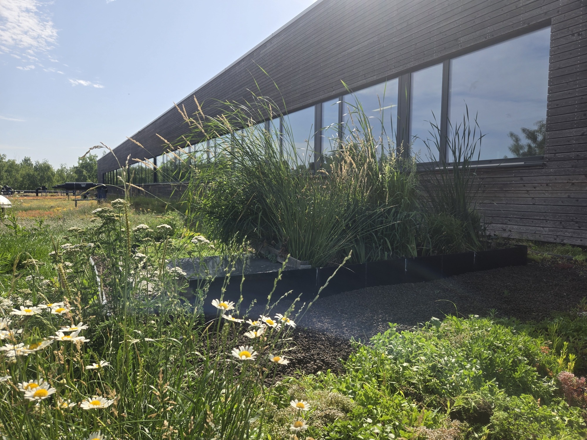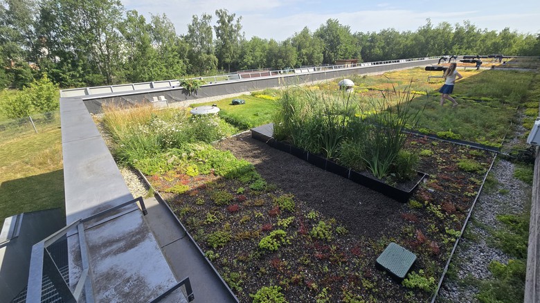 Střešní kořenová čistírna v kombinaci se zelenou střechou ze substrátu na bázi recyklovaných materiálů přináší komplexní cirkulární řešení pro ozelenění střech. Zavlažování odpadní vodou umožňuje růst na vodu náročnější vegetace s vyšším evaporačním ochlazovacím účinkem při zachování nulové spotřeby pitné vody, což vede k vytvoření rozmanitého biodiverzního stanoviště. Odpadní voda obsahuje množství nutrientů, což odstraňuje potřebu dodatečného hnojení. V souvrství zelené střechy je použit nově registrovaný cirkulární střešní minerální substrát skládající se z podstatné části z recyklovaného suťového demoličního odpadu a na nutrienty bohatého pyrolizovaného čistírenského kalu.